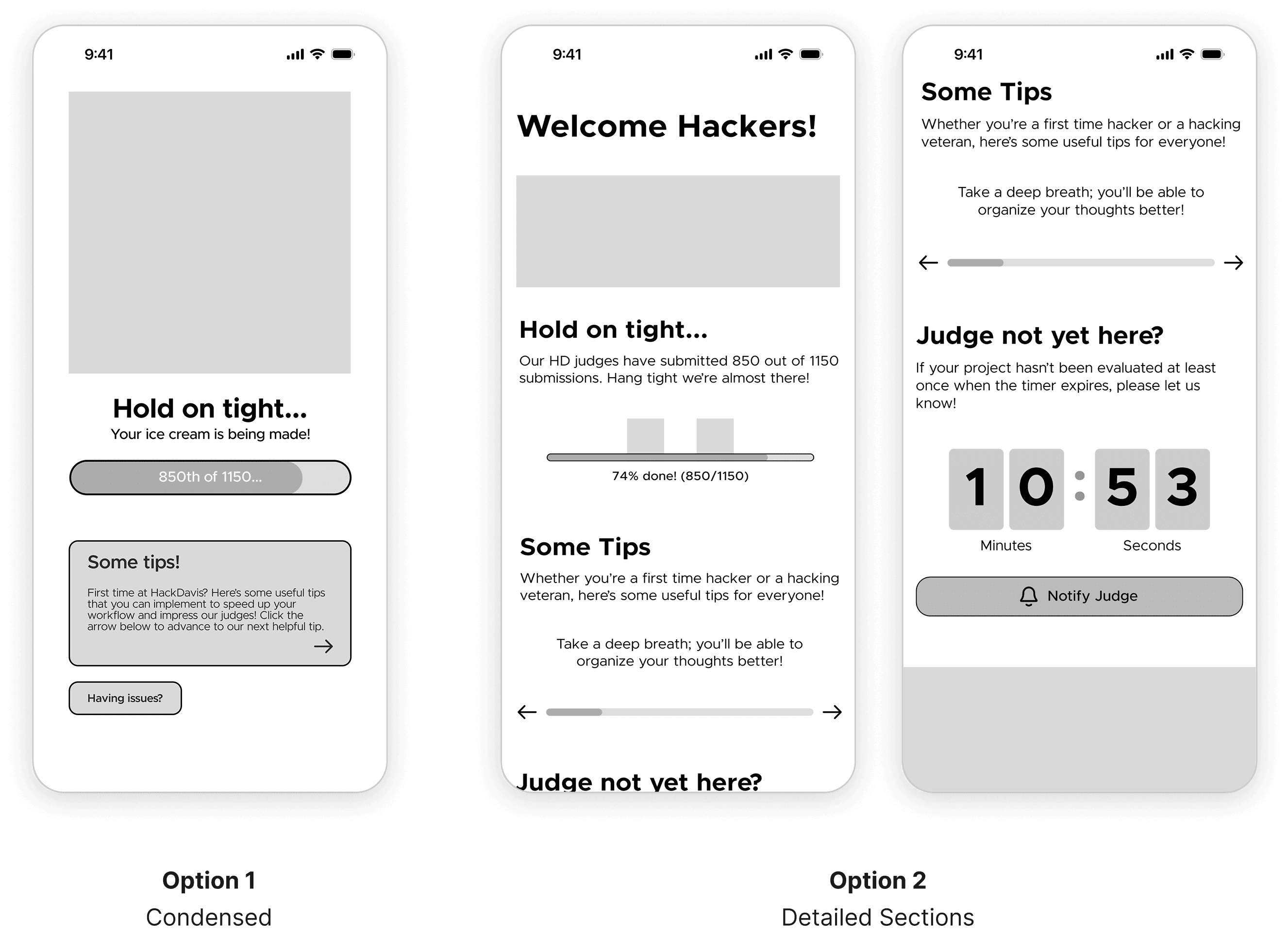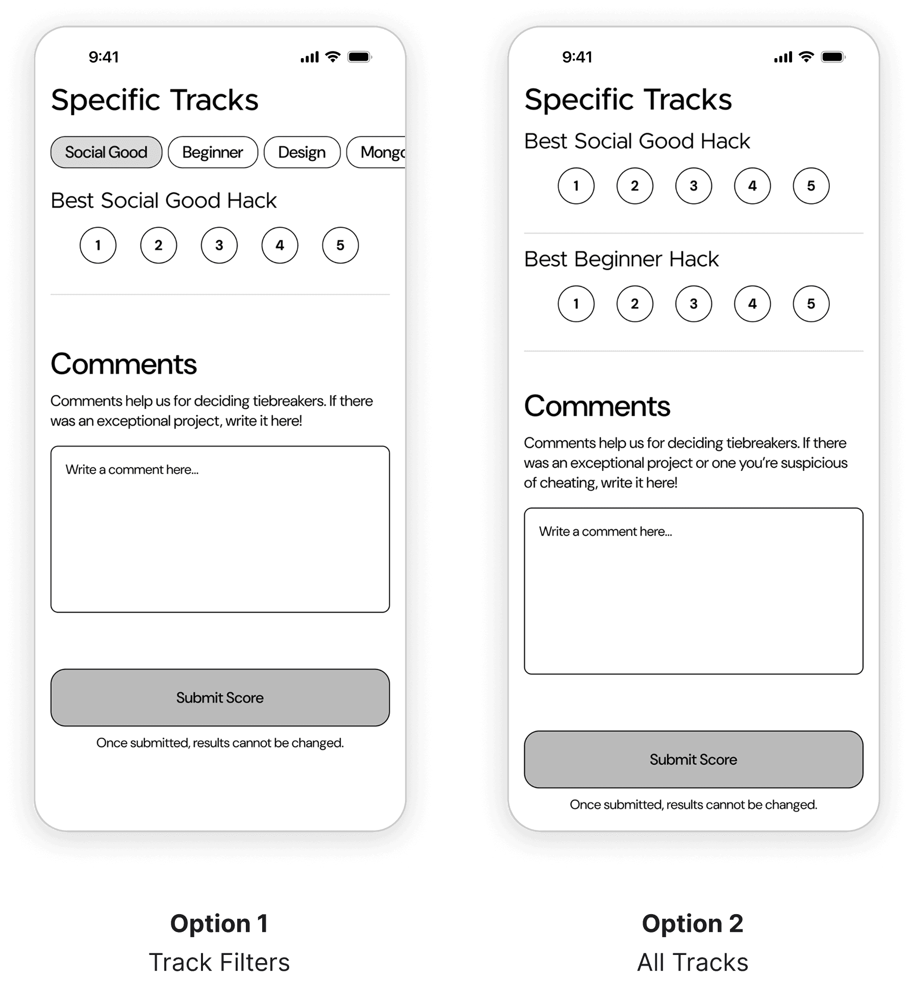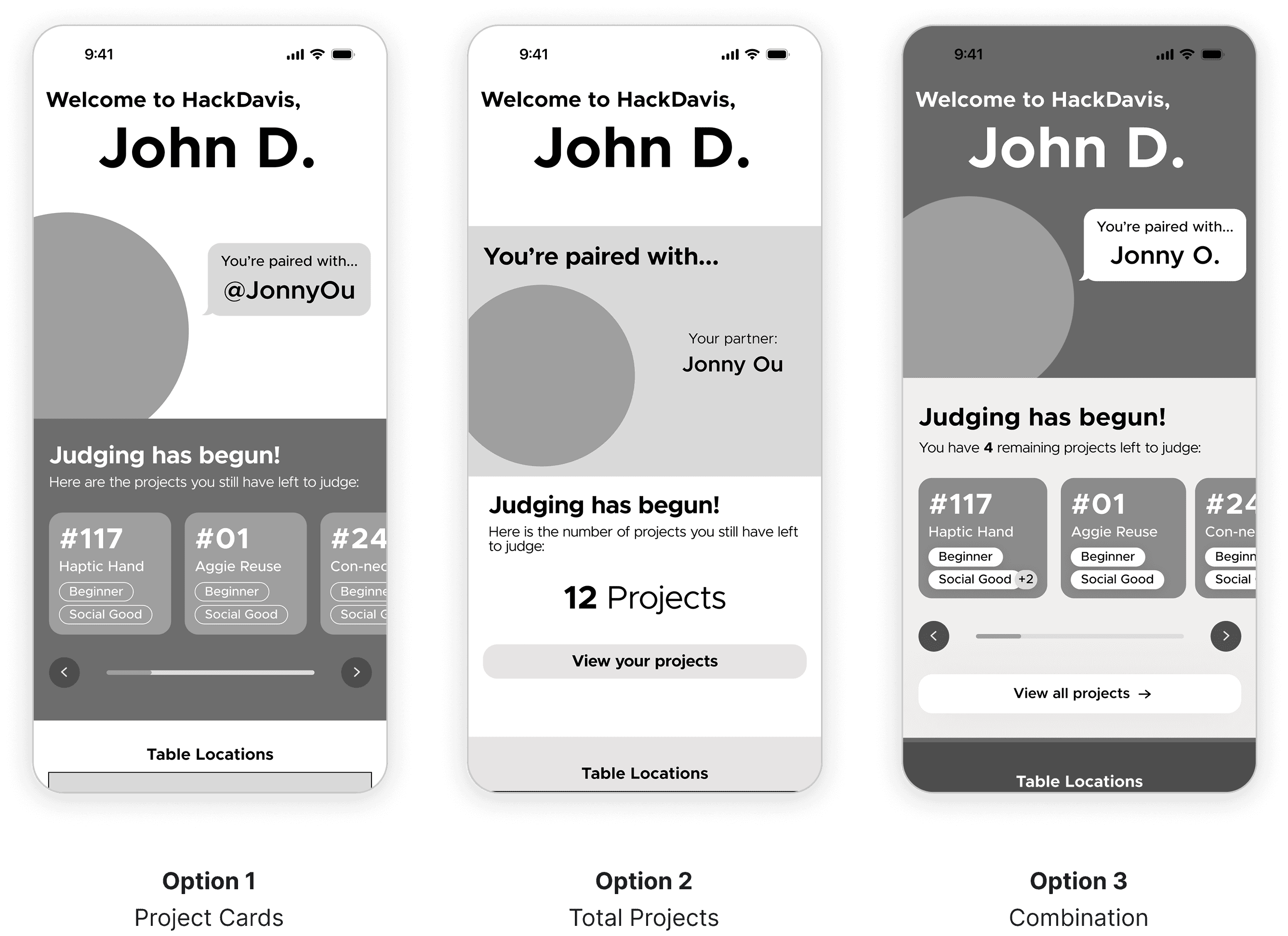 While beginning my explorative ideation phase, I kept the importance of shifting perspectives in mind to ensure my designs aligned with the project's diverse goals. This next phase focused on exploring a wide variety of new approaches to creating an efficient and streamlined product experience for both judges and hackers. To land the best option, my decisions were further evaluated using A/B testing feedback from 6 designers, leads, and prior judges.