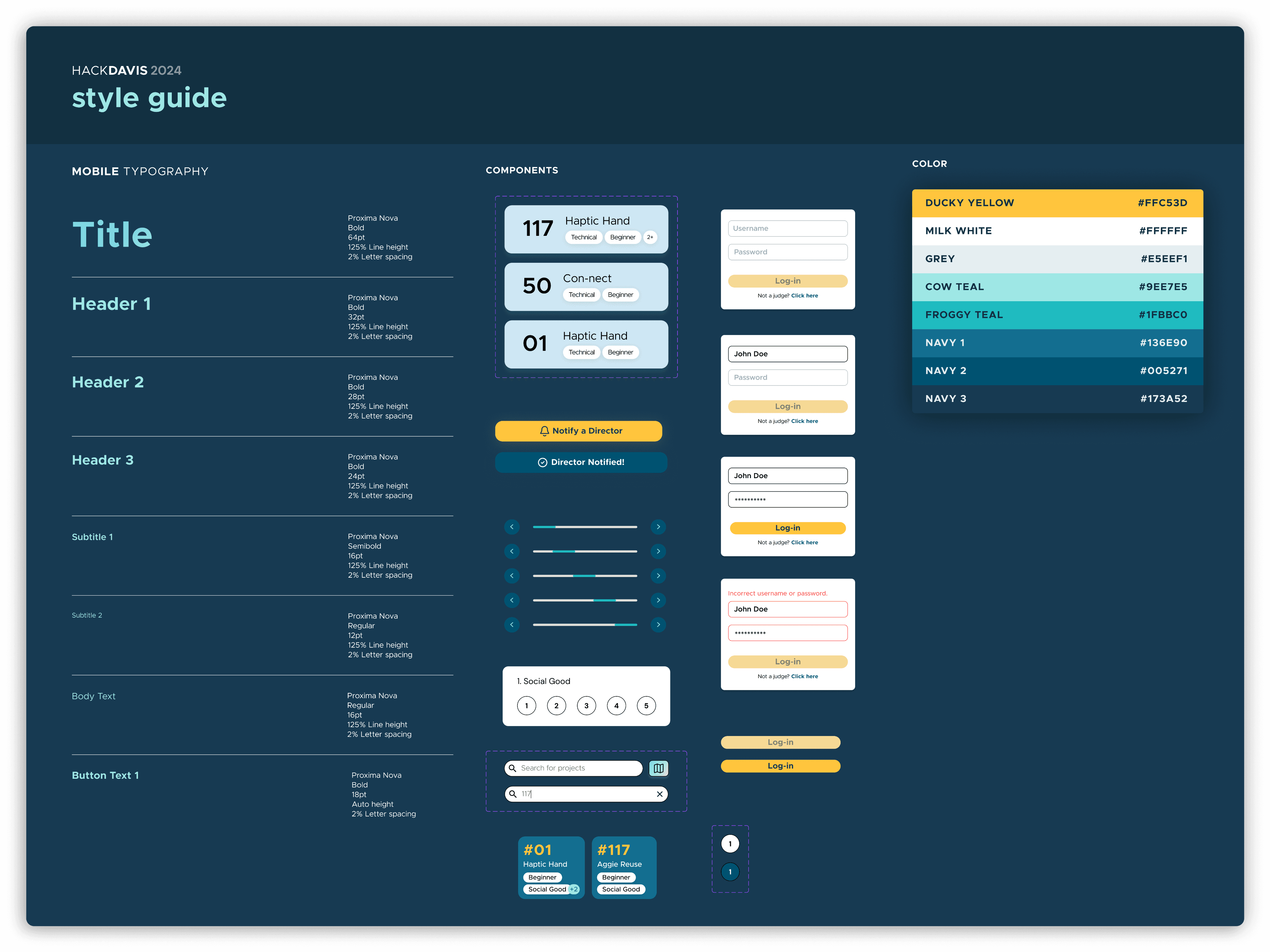 To ensure visual and functional consistency across the judging platform, I created a comprehensive design system that standardized mobile typography, color, and components. This system not only streamlined development and improved scalability but also reinforced HackDavis' branding, balancing bold and high-contrast colors with deep navy shades for clarity and hierarchy. By creating reusable UI components, the system facilitated developer handoff and maintained design consistency across all judging interfaces. With this foundation in place, I implemented these guidelines into my high-fidelity wireframes, bringing the judging app to life with an intuitive and polished experience.