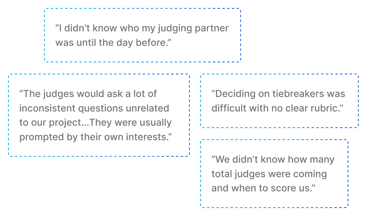 Miscommunication about which teams still needed judging often caused frequent delays. Judges occasionally asked irrelevant questions due to limited knowledge or a lack of clear instructions, further slowing the process. The overall complexity of the process, combined with the absence of a clear and accessible judging guide, created unnecessary confusion, suggesting that these inefficiencies directly contributed to leaving participants waiting in confusion and uncertainty without clear updates or timelines.