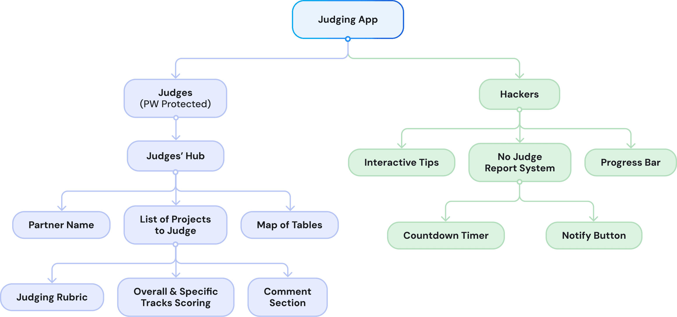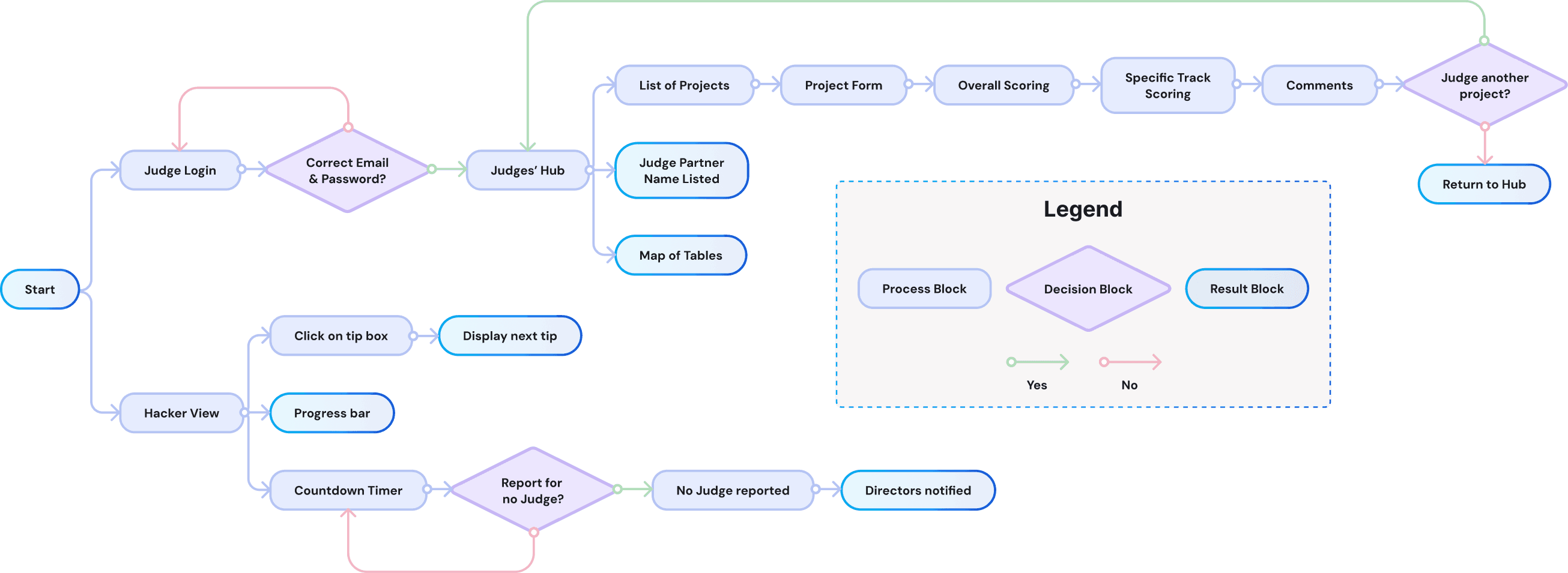 With our users' needs identified, we began brainstorming solutions to address their pain points. Creating an information architecture tree helped me visualize and organize the overall workflow, while user flows provided insight into exactly what judges and hackers experience when taking specific actions.