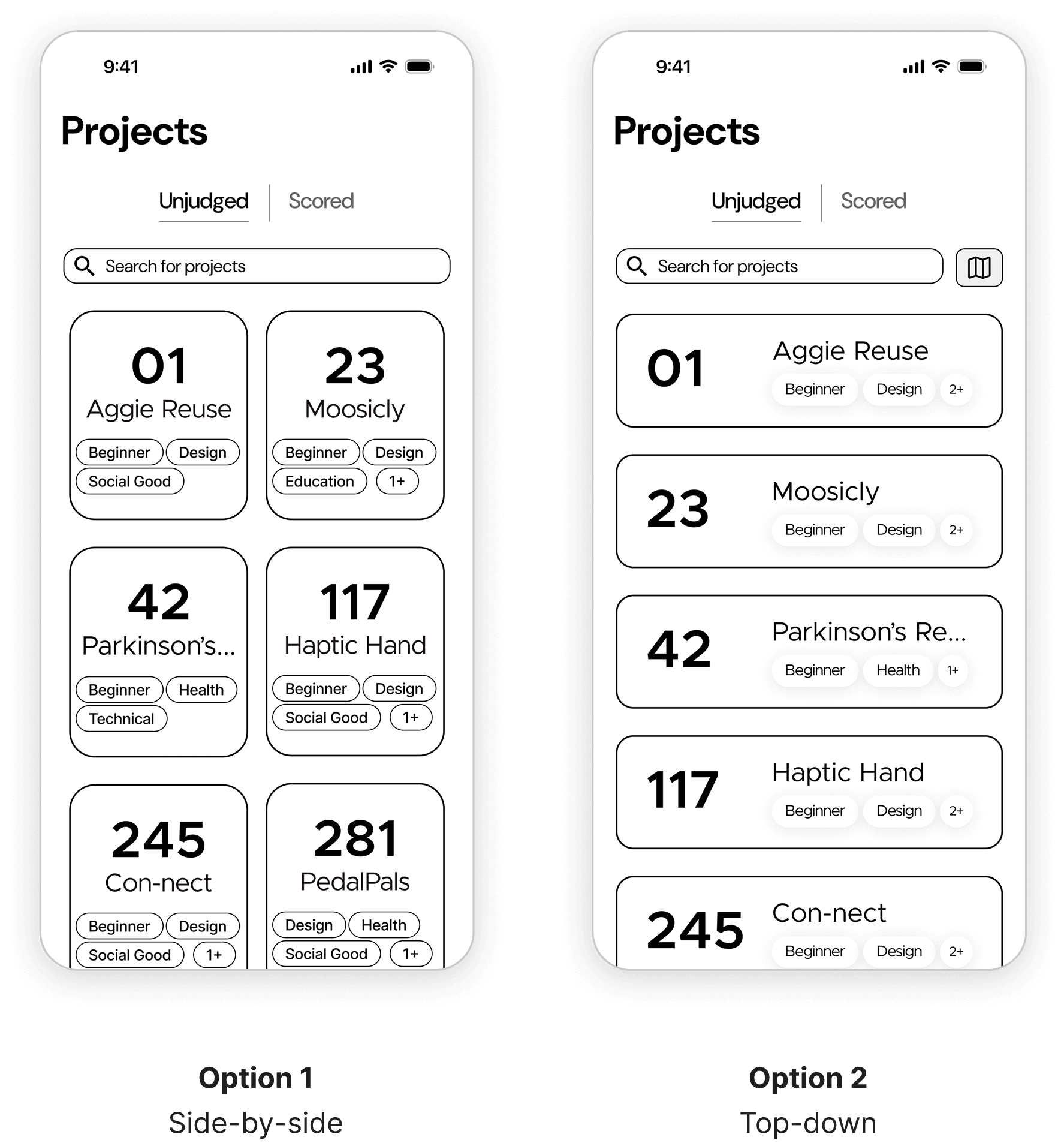 🟢 — Allows judges to scan projects more easily, focusing on one at a time to improve task flow. A/B tests overwhelmingly suggest that the top-down layout feels more intuitive for search and interaction