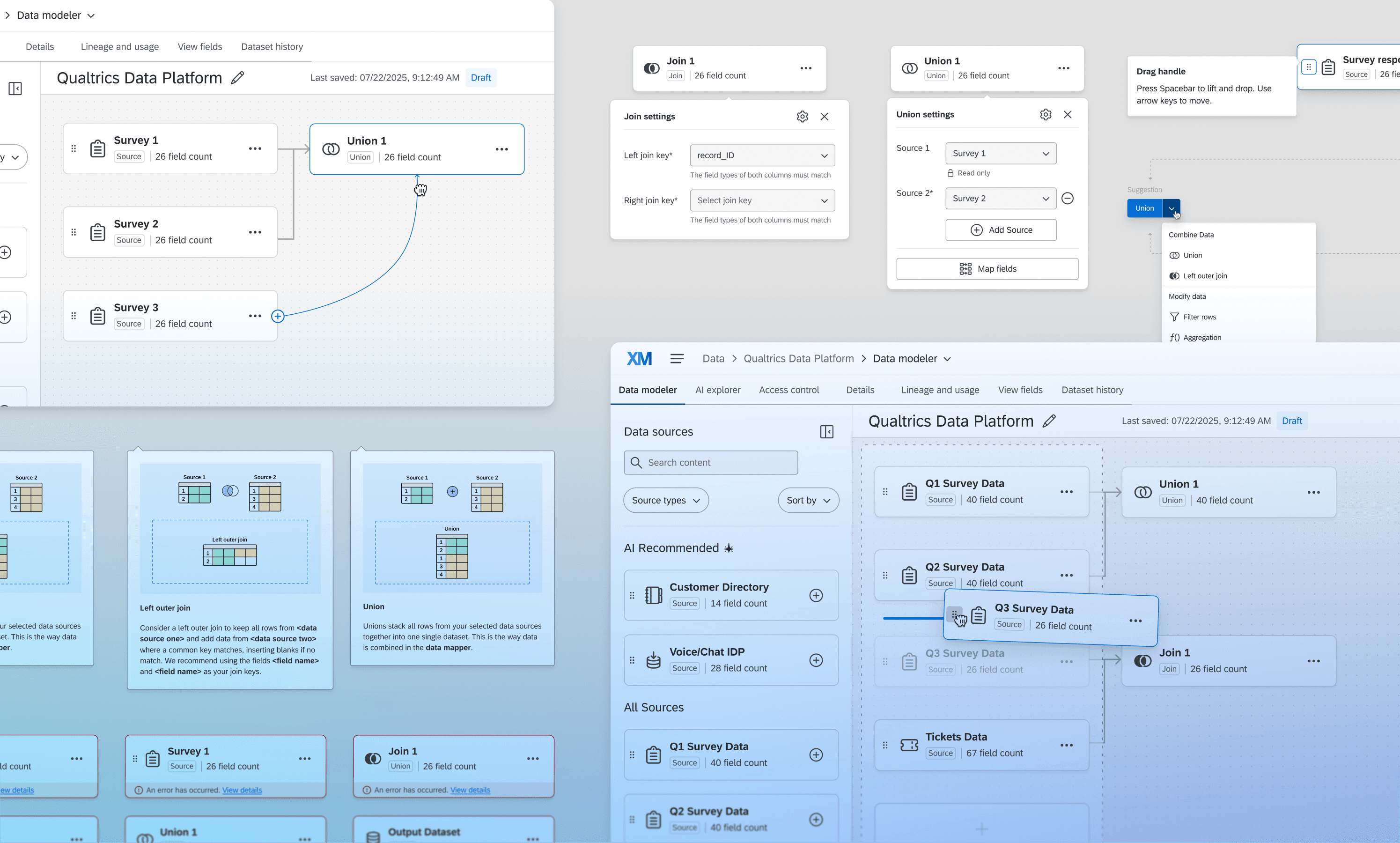 During my summer internship at Qualtrics, I worked on redesigning a complex data flow builder for our expert data analyst users. The key goal was to integrate fluid interaction patterns to create a non-destructive workflow that encouraged confident experimentation.